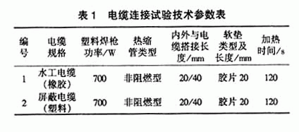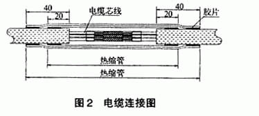 芯线连接后在接头处套上Φ=(1.5~1.8)D的热缩管(D为电缆直径),热缩管热缩后再套上相同或稍大直径的热缩管,形成双层热缩接头,见图2。量测并记录每根芯线的断开电阻,电缆连接参数见表1。