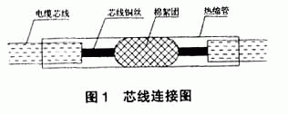 专用工具剥出一定长度的电缆芯线和芯线铜丝,并确保芯线及铜丝不受损伤。芯线铜丝外露长约1cm,芯线不锡焊,用热缩管连接,两头芯线之间断开处填塞棉絮,并使其紧密,见图1。