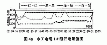 四芯水工电缆各芯线的断开电阻在加压后有明显的减小,但均>180MΩ,在持续加压过程中基本处于稳定,仅随压力的微小变化而有所变化,在试验结束压力释放后各芯线的断开电阻又回到初始值(500MΩ以上)。断开电阻在加压后有明显的降低,分析认为是压力使得断开芯线铜丝间的距离变短而引起。四芯水工电缆各芯线的断开电阻加压前后的电阻变化曲线见图4a和图4b,为了能区分清楚,图4a和图4b中凡电阻测值>500MΩ的以700MΩ表示。